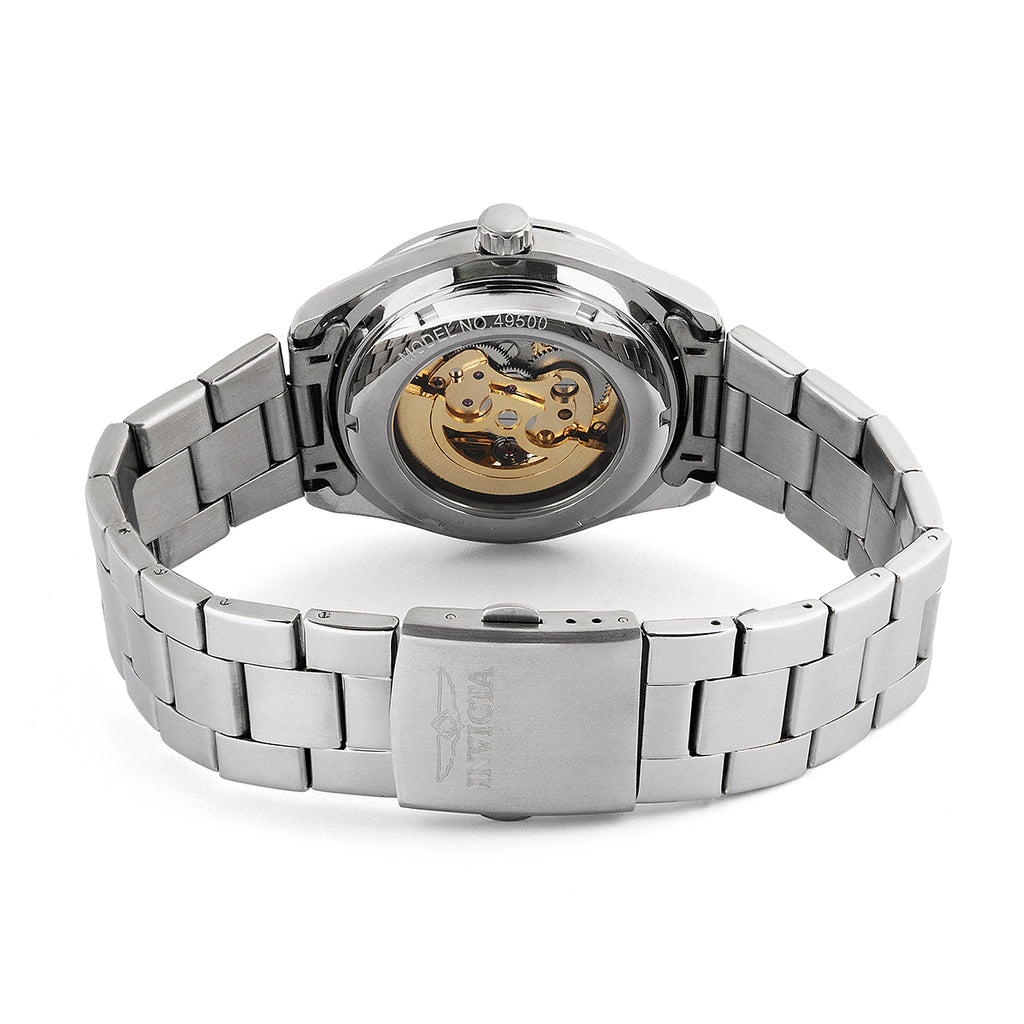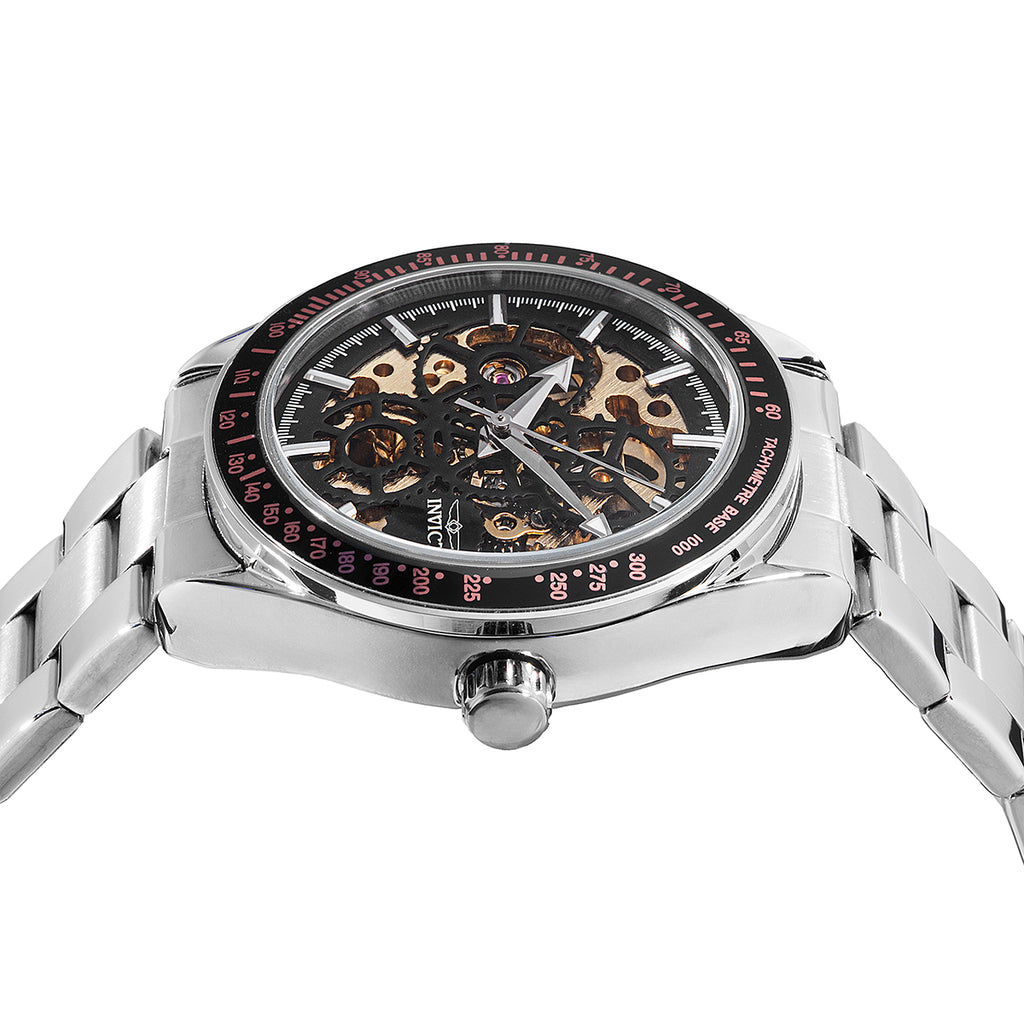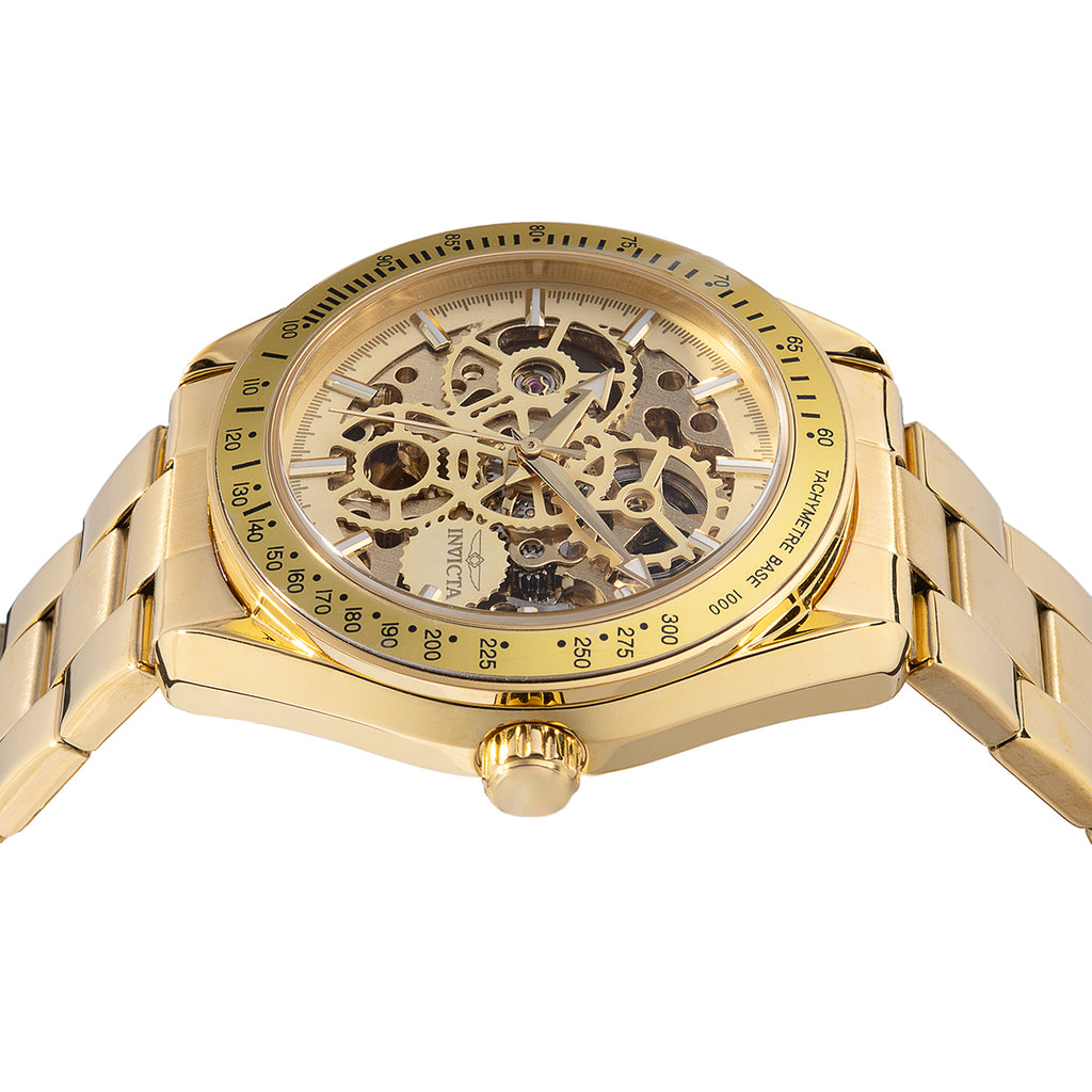 Um clássico da Invicta com design aberto (“skeleton”) que revela a engenharia do calibre automático. A caixa de 43 mm em aço e o mostrador em cobre com opções de cor Preto/Verde ou Dourado/Verde criam presença marcante no pulso, mantendo conforto para uso diário.
