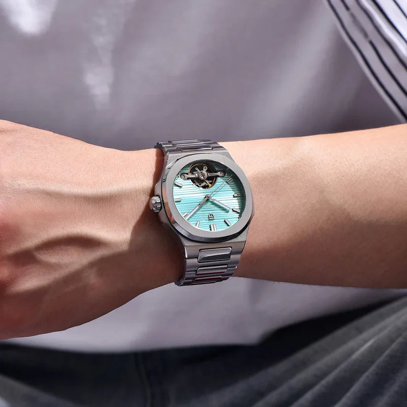 Relógio esportivo de 42 mm em aço 316L, coroa rosqueada e cristal de safira com antirreflexo. Movimento automático E325, perfil fino (11,7 mm) e 100 m de resistência à água.
